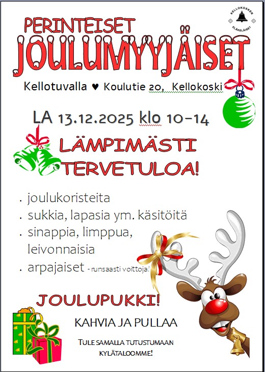 Eläkeläisten perinteiset joulumyyjäiset Kellotuvalla 13.12.2025 klo 10.00-14.00.